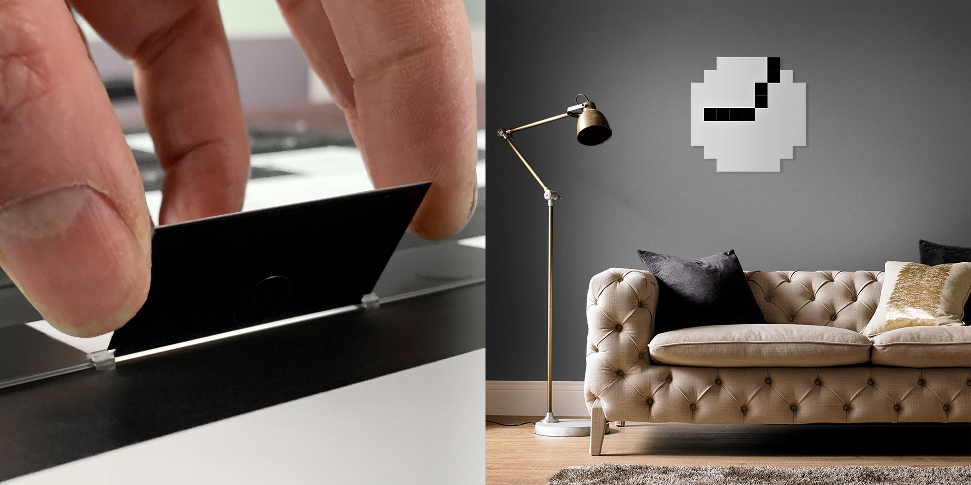 Meet our newest creation. Klapklok is a mechanical pixel clock with 69 elements. It’s a rounded square of 45 cm, just 13 mm thin, and it diplays a whopping half a dot per inch. Lightweight paper-like flaps switch from black to white, acting as pixels. Every 2,5 minutes, the hands on the clock are redrawn. In between, Klapklok is completely inert. It doesn’t emit light, it’s silent and it uses almost no energy when the flaps are not in motion.