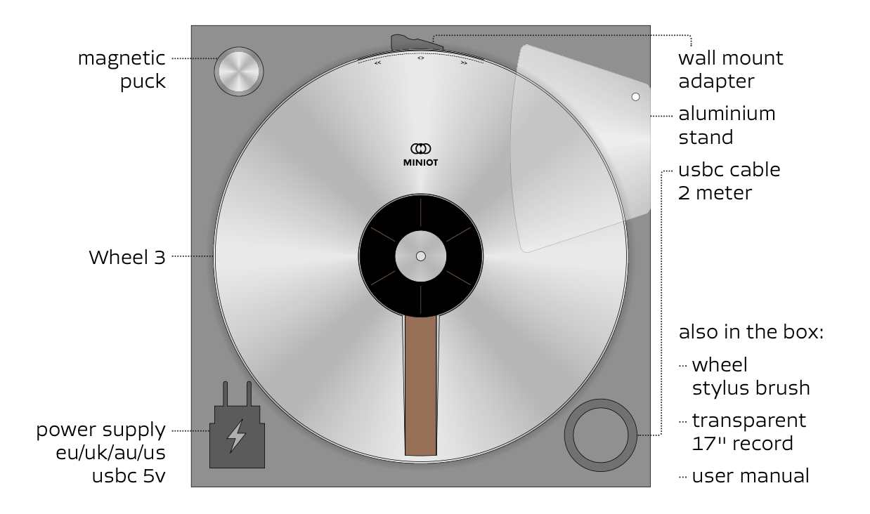 Wheel 3 comes in a compact box packed with accesories. For vertical and wall placement, a wall mount adapter and an aluminium stand are included. A magnetic puck, a stylus brush, a transparent record and a user manual are also in the box. Each Wheel 3 also come with a EU, UK, US or AU power supply and a 2 meter power cable.