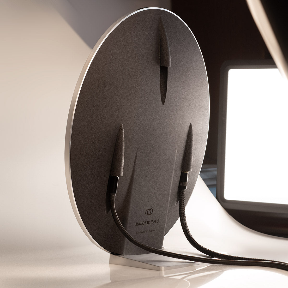 Wheel 3 is powered by 5 volt direct current. A balanced usb-c power supply is included in the box. A high-end line output serves almost all uses. The gold plated 3,5 mm aux socket accepts wired connections to headphones, amplifiers and active speakers. Wheel also directly connects to Sonos*, Bang & Olufsen, Devialet and other home hifi systems.